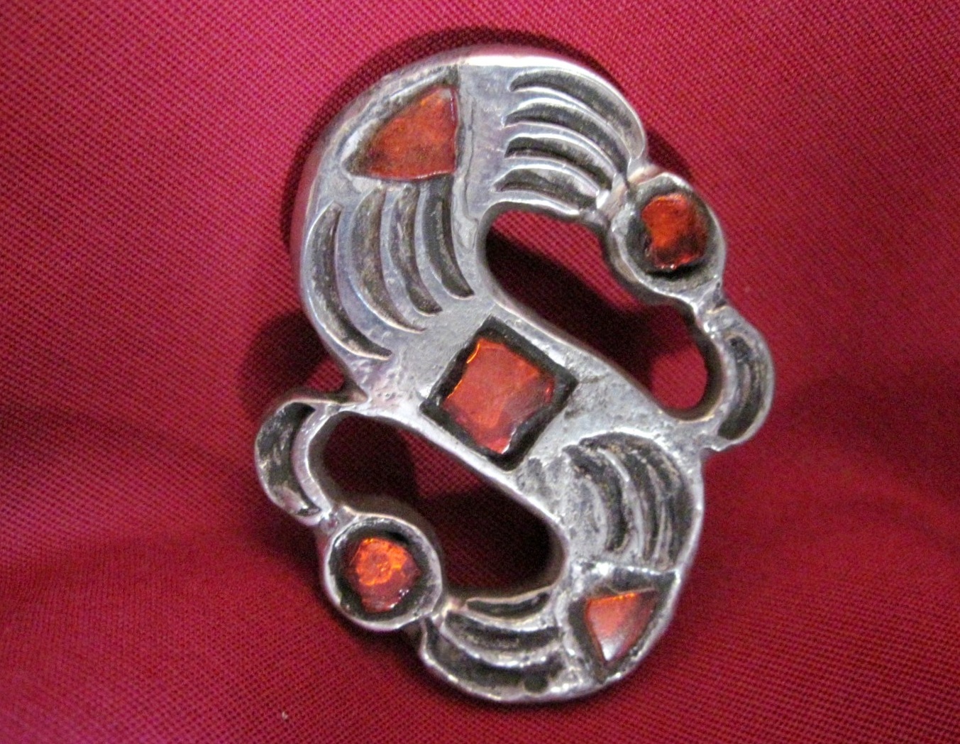 Originale fibula a “S” in argento con inserti vitrei di colore rosso.