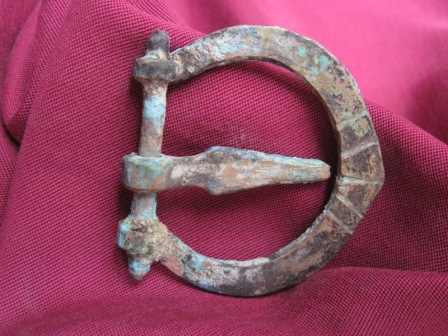 Staffa di fibbia a forma di ferro di cavallo, con ardiglione e asticella di chiusura.